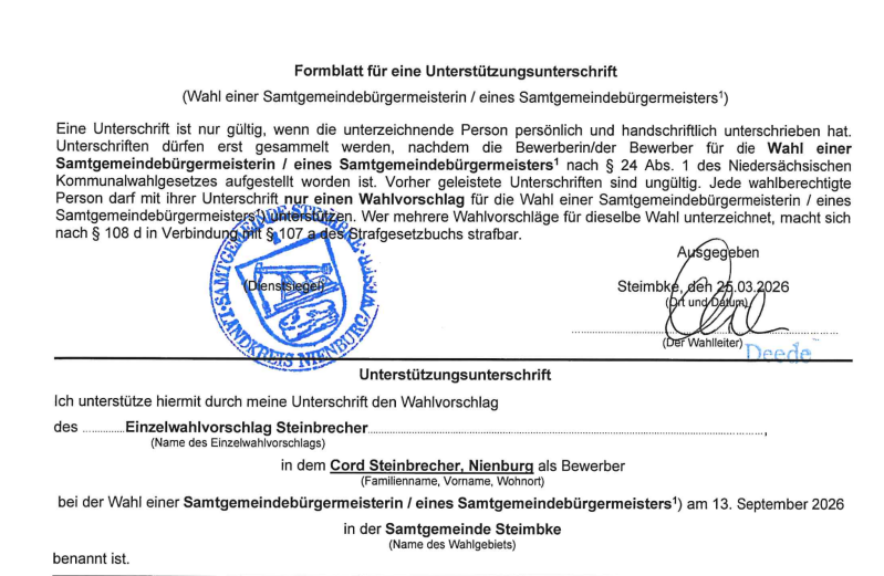 Um meine unabhängige Kandidatur als Samtgemeindebürgermeister zu erklären, benötige ich insgesamt 60 Unterstützungsunterschriften von Wahlberechtigten aus der Samtgemeinde Steimbke. Wer meine Kandidatur unterstützen möchte, den oder die bitte ich, das Formblatt entsprechend auszufüllen und mir eingescannt an info@eincordeinwort.de zurückzuschicken. Das wäre klasse. Besten Dank allen Unterstützenden.